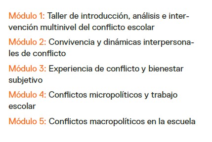 Docentes y profesionales de aula (profesores de básica y media, educadores diferenciales, profesores jefes, asistentes con funciones formativas). Buscan manejar constructivamente los conflictos cotidianos del aula y fortalecer su labor formativa.